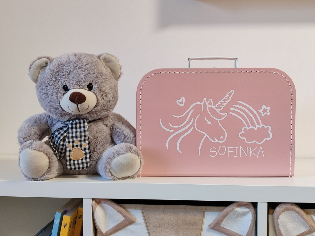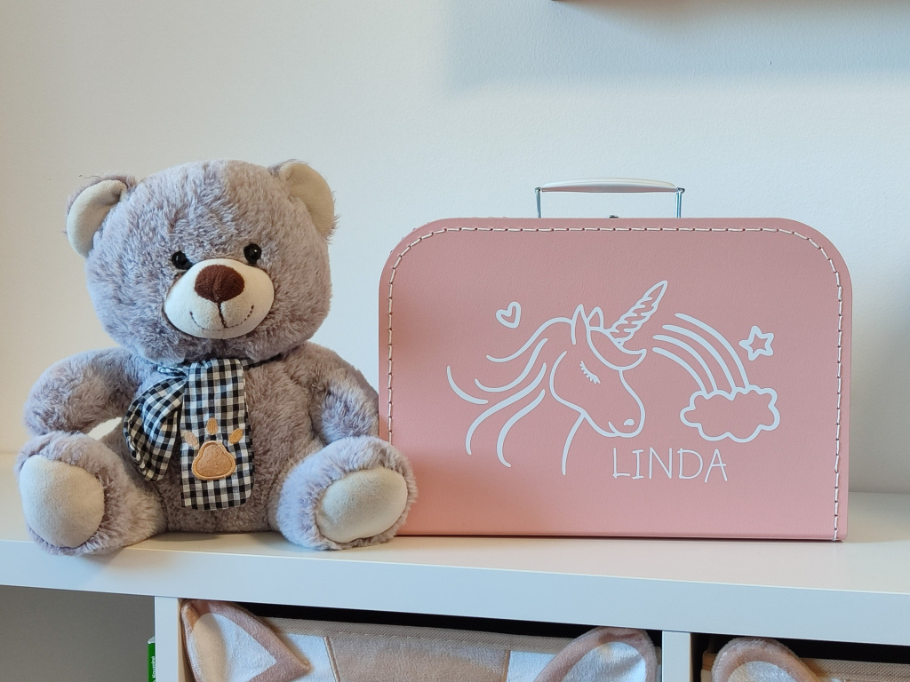 Kufřík se jménem na přání a motivem jednorožce je krásným dárkem pro miminko. Může sloužit jako vkusná a originální dekorace do dětského pokojíčku i jako úložný prostor pro vzpomínkové předměty - například první ultrazvuk, náramek z porodnice, první botičky a mnoho dalšího.
