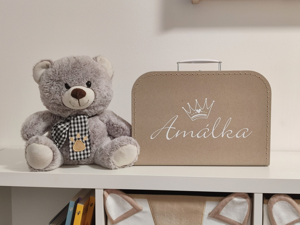 Kufřík se jménem na přání a motivem korunky je krásným dárkem pro miminko. Může sloužit jako vkusná a originální dekorace do dětského pokojíčku i jako úložný prostor pro vzpomínkové předměty - například první ultrazvuk, náramek z porodnice, první botičky a mnoho dalšího.