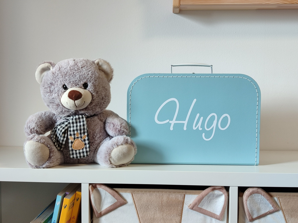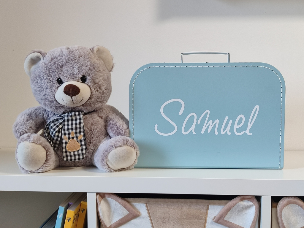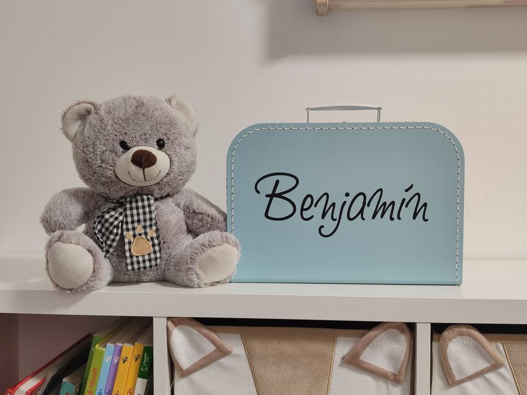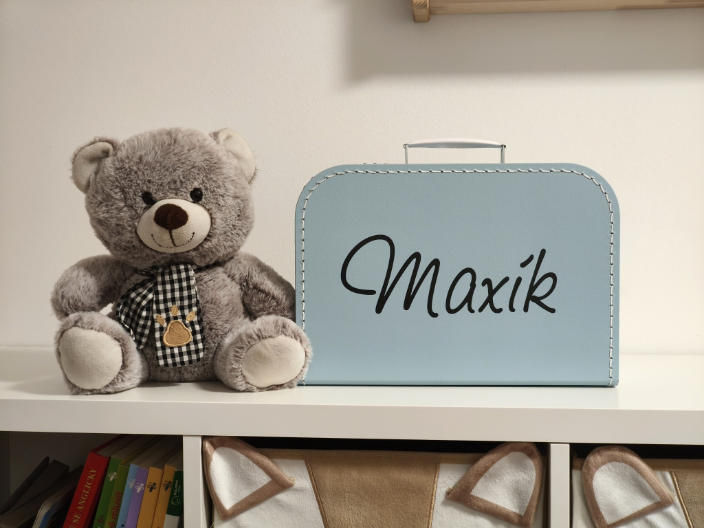 Vyberte si barvu kufříku a textu, napište jméno dítěte a vytvořte tak jedinečný dárek k narozeninám, Vánocům nebo jen tak pro radost.