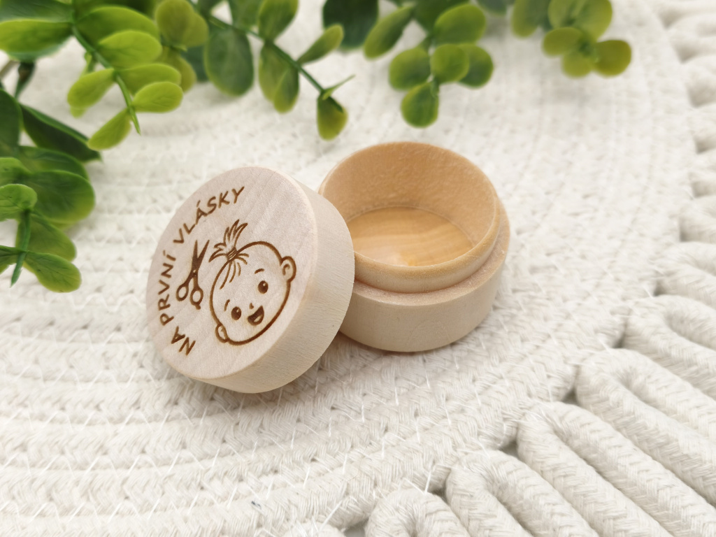 Krabička je vyrobena z přírodního dřeva a zdobena precizním gravírováním, které jí dodává jemný a nadčasový vzhled. Díky svému malému a praktickému rozměru je ideální právě pro uchování prvního pramínku vlásků a snadno ji uložíte mezi rodinné vzpomínky.
