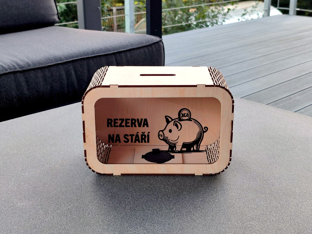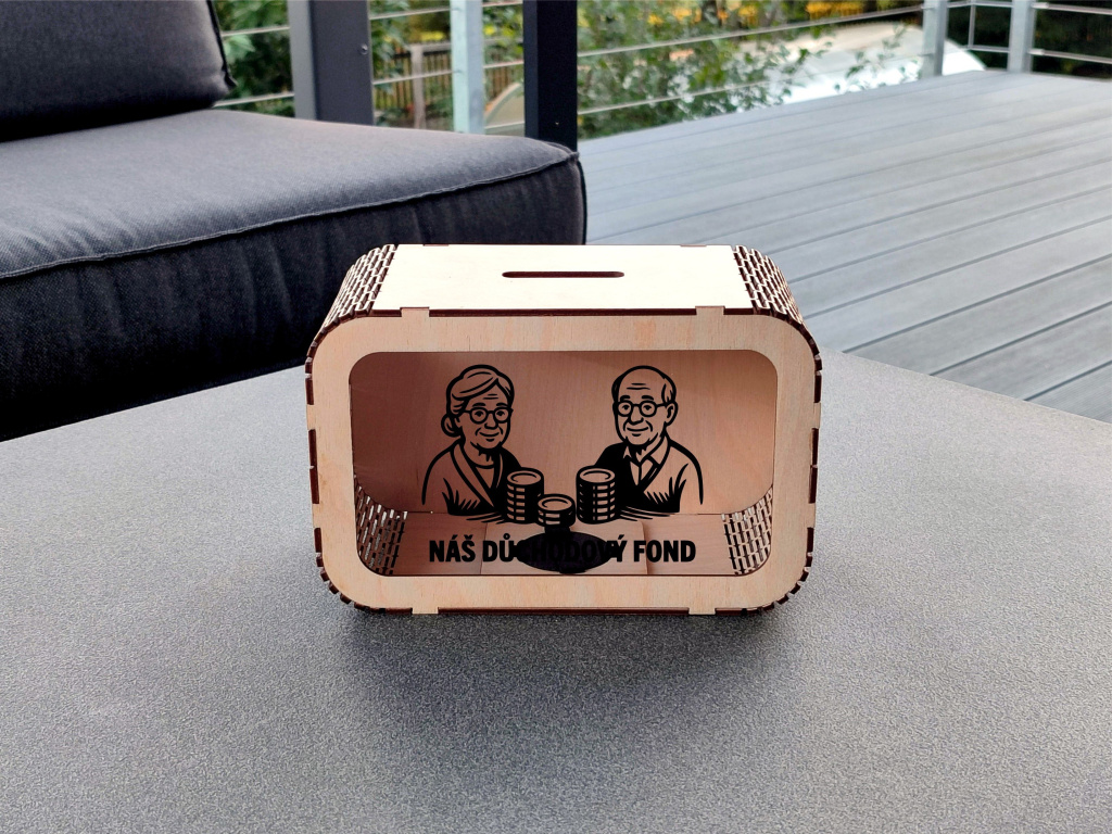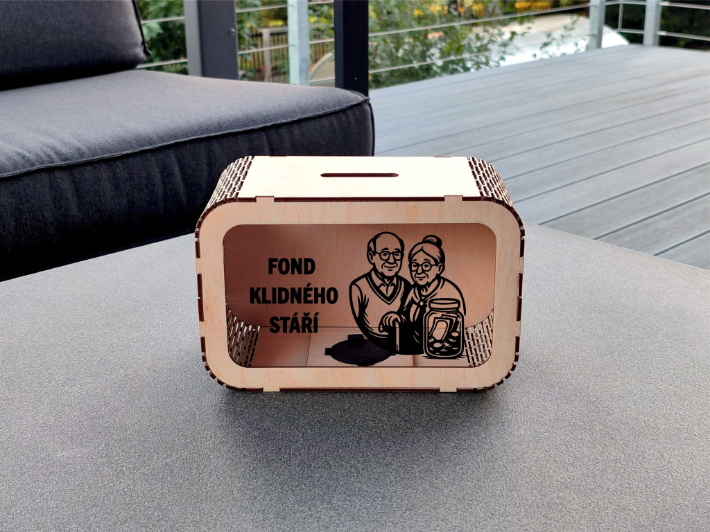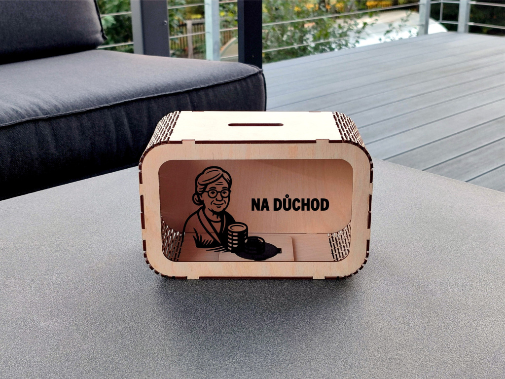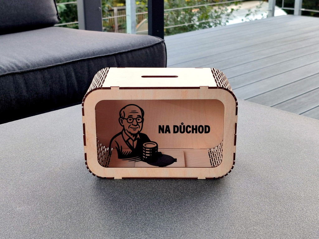 Dřevěná pokladnička „Na důchod“ je vtipný i praktický dárek pro každého, kdo si rád spoří na budoucnost. Je to také stylový způsob, jak předat peníze kolegovi při odchodu do důchodu. Přední stranu pokladničky tvoří průhledné plexisklo, díky kterému můžete sledovat, jak úspory přibývají. Pokladnička má na vrchní části otvor pro vhazování mincí nebo bankovek a ze spodní strany víčko pro jejich vyndání. Navíc si ji můžete přizpůsobit dle svých představ – vyberte si motiv i jeho barvu. Více informací