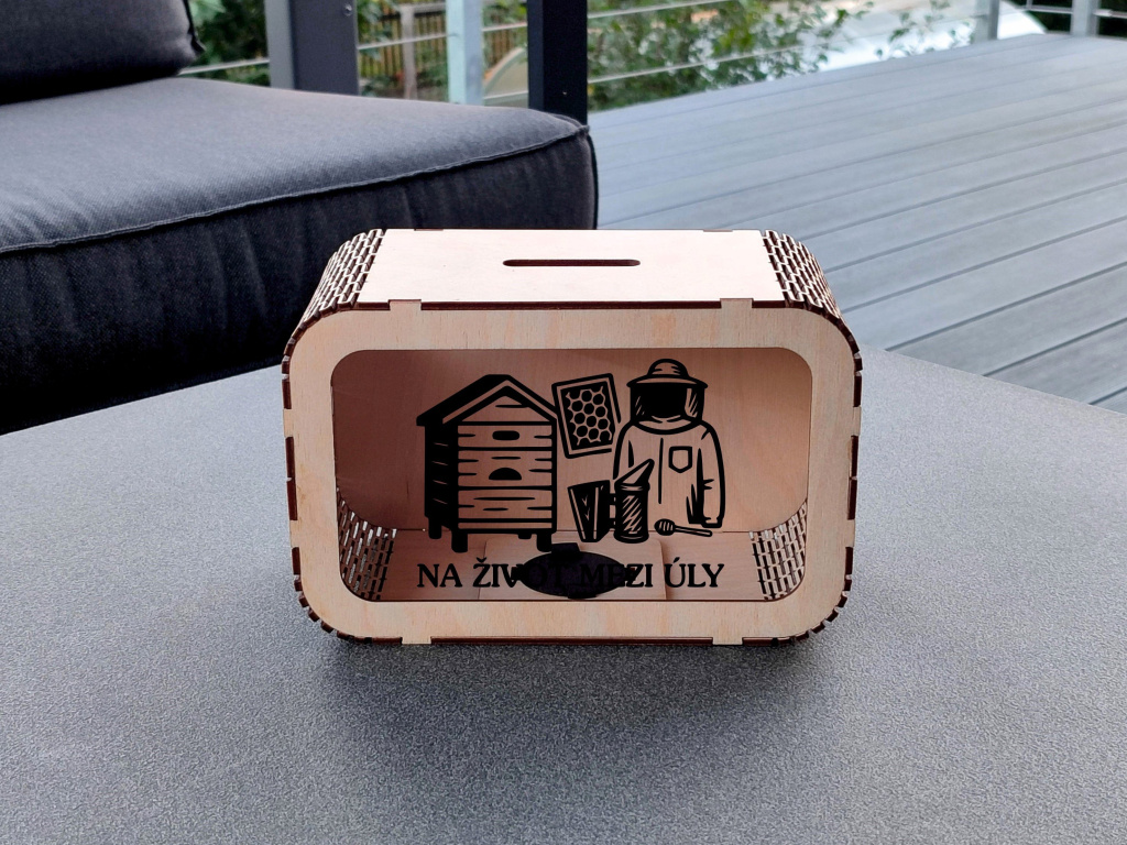 Sháníte dárek pro včelaře? Dřevěná pokladnička s motivem úlu, včelaře a nápisem „Na život mezi úly“ potěší každého, kdo má rád včely a včelaření. Přední stranu pokladničky tvoří průhledné plexisklo, díky kterému můžete sledovat, jak úspory postupně přibývají. Pokladnička má na vrchní části otvor pro vhazování mincí nebo bankovek a ze spodní strany víčko pro jejich vyndání. Motiv na pokladničce je vyroben z kvalitní vinylové fólie, jejíž barvu si můžete zvolit v konfigurátoru produktu. Více informací