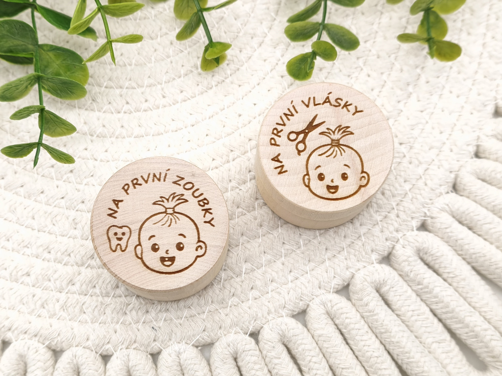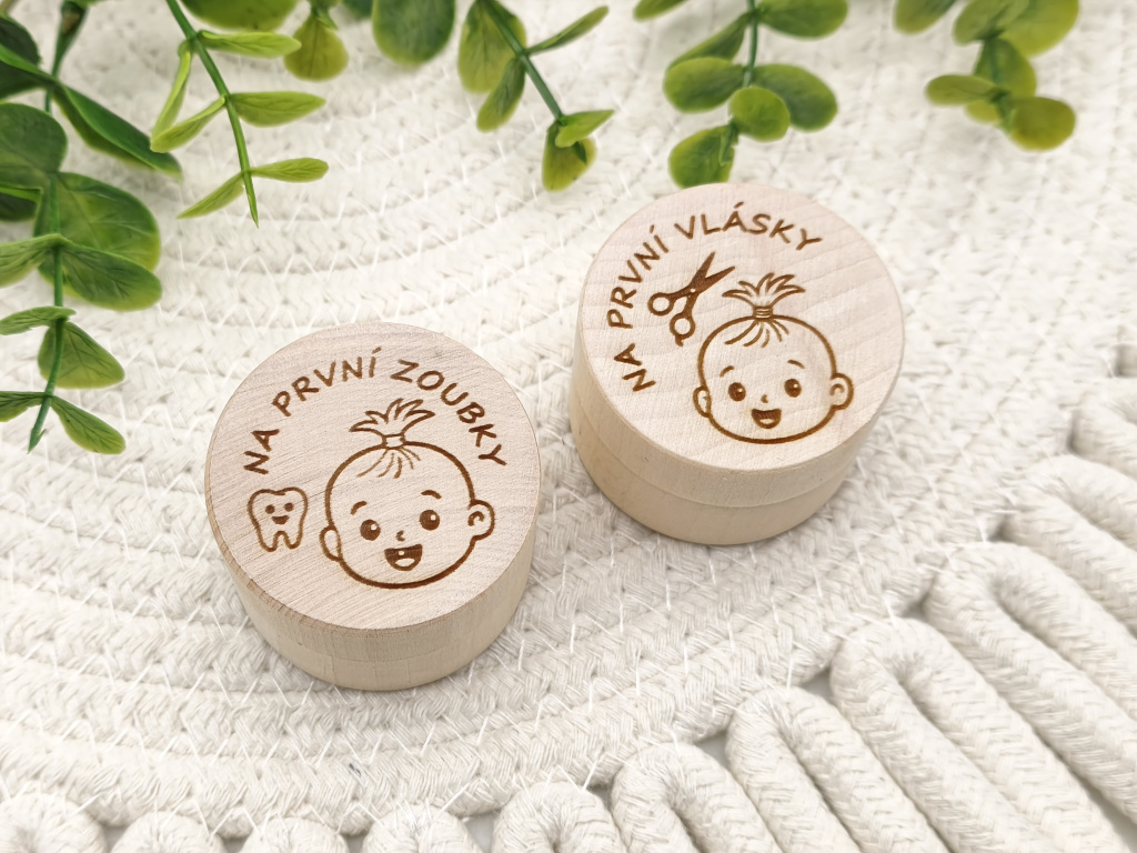 Sada dvou dřevěných krabiček s nápisy „Na první zoubky“ a „Na první vlásky“ s jemným dětským motivem je krásným způsobem, jak uchovat první zoubky i první pramínek vlásků. Přírodní dřevo a precizní gravírování vytváří něžnou a nadčasovou památku na dětství. Více informací