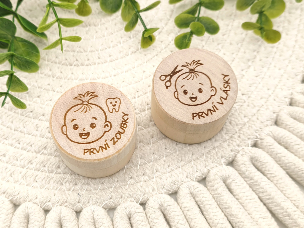 Sada dvou dřevěných krabiček „První zoubky“ a „První vlásky“ s jemným dětským motivem je krásným způsobem, jak uchovat první zoubky i první pramínek vlásků. Přírodní dřevo a precizní gravírování vytváří něžnou a nadčasovou památku na dětství. Více informací