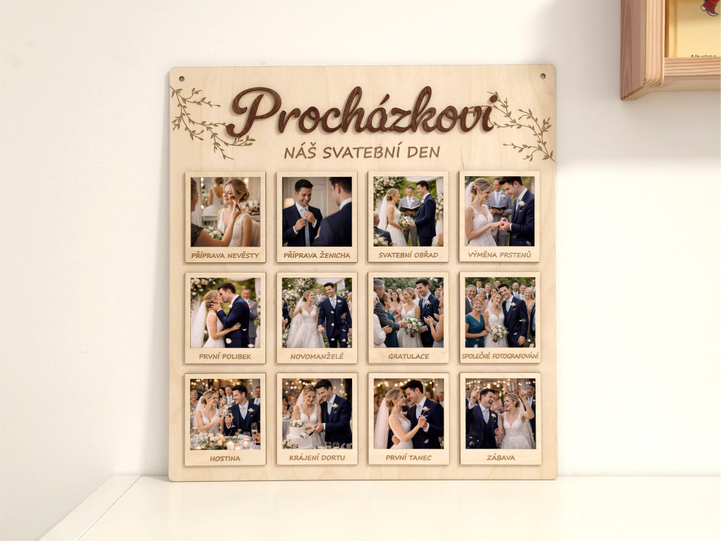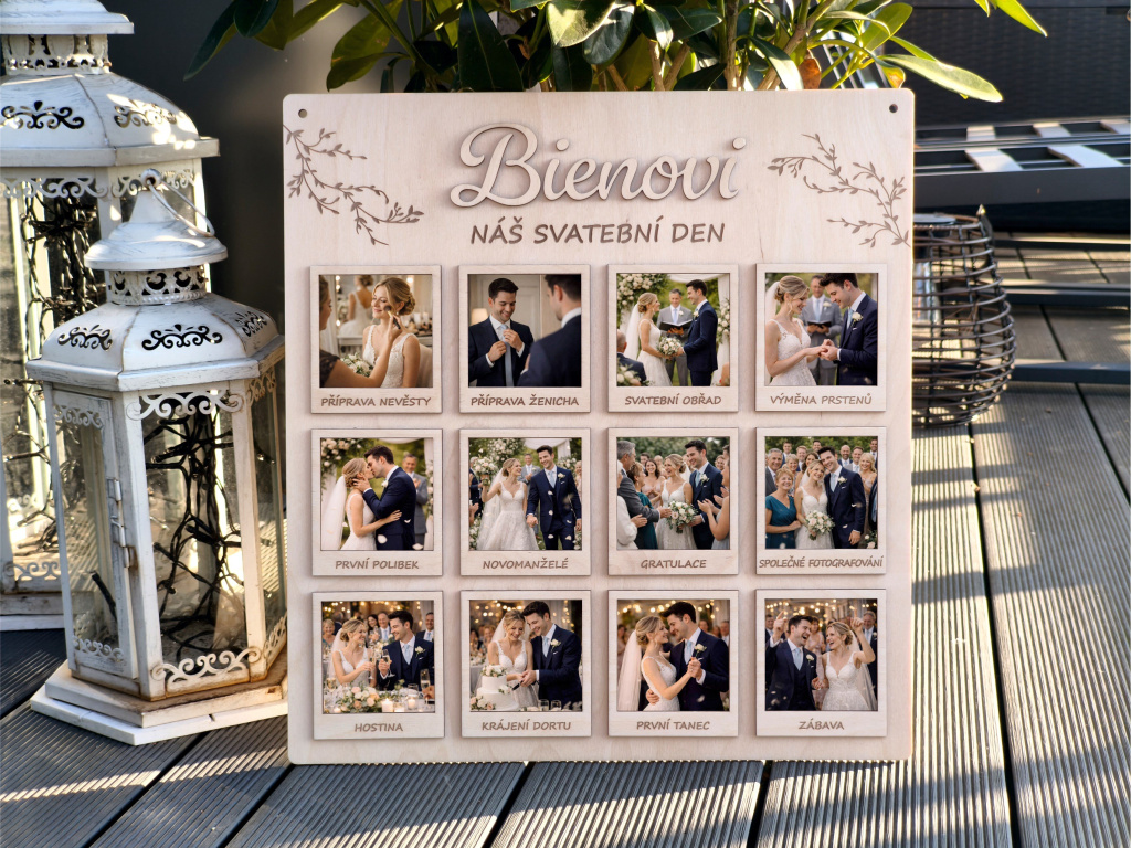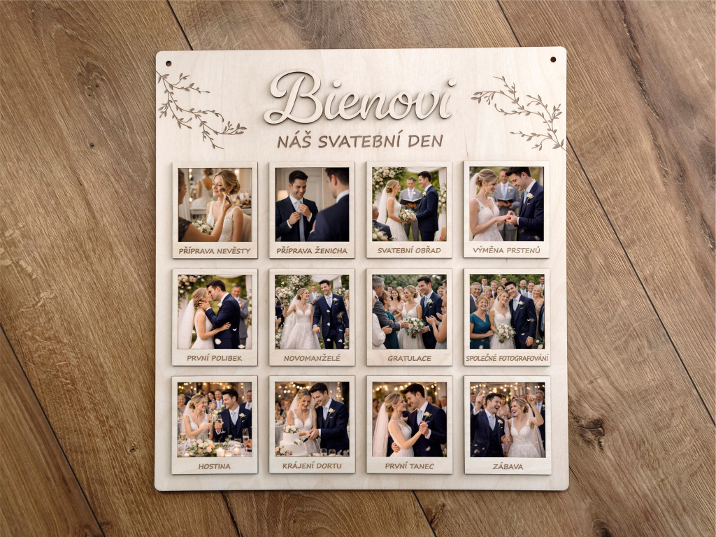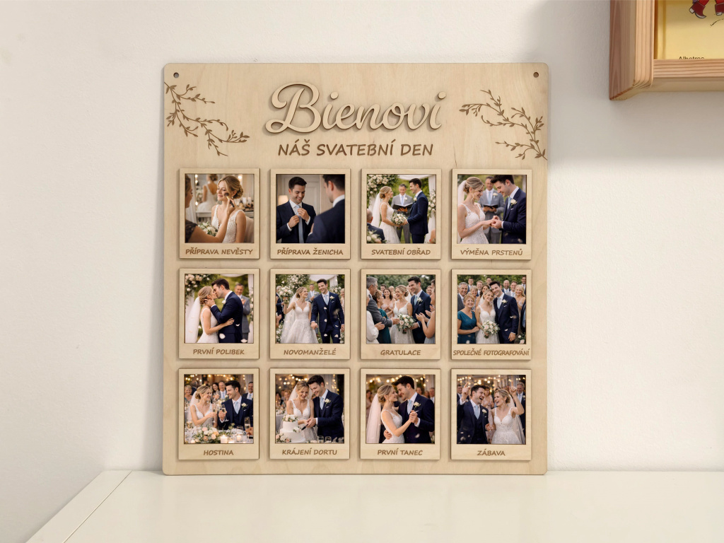 Představujeme Vám krásnou a originální dřevěnou desku na svatební fotografie s jemným gravírovaným motivem větviček, 3D příjmením novomanželů dle Vašeho přání a dvanácti 3D rámečky, které zachycují celý svatební den ve 12 nezapomenutelných okamžicích. Jedná se o jedinečný a osobní svatební dar, který nebude ležet v koutě, ale stane se přirozenou součástí interiéru a každodenní připomínkou jednoho z nejkrásnějších dnů v životě.