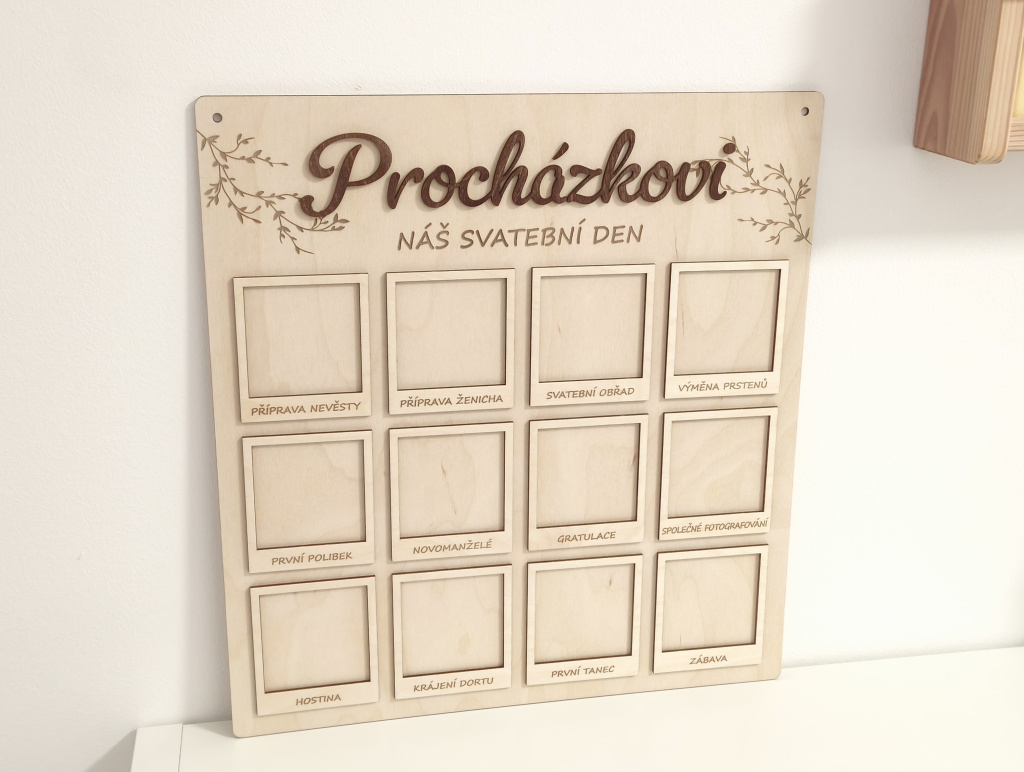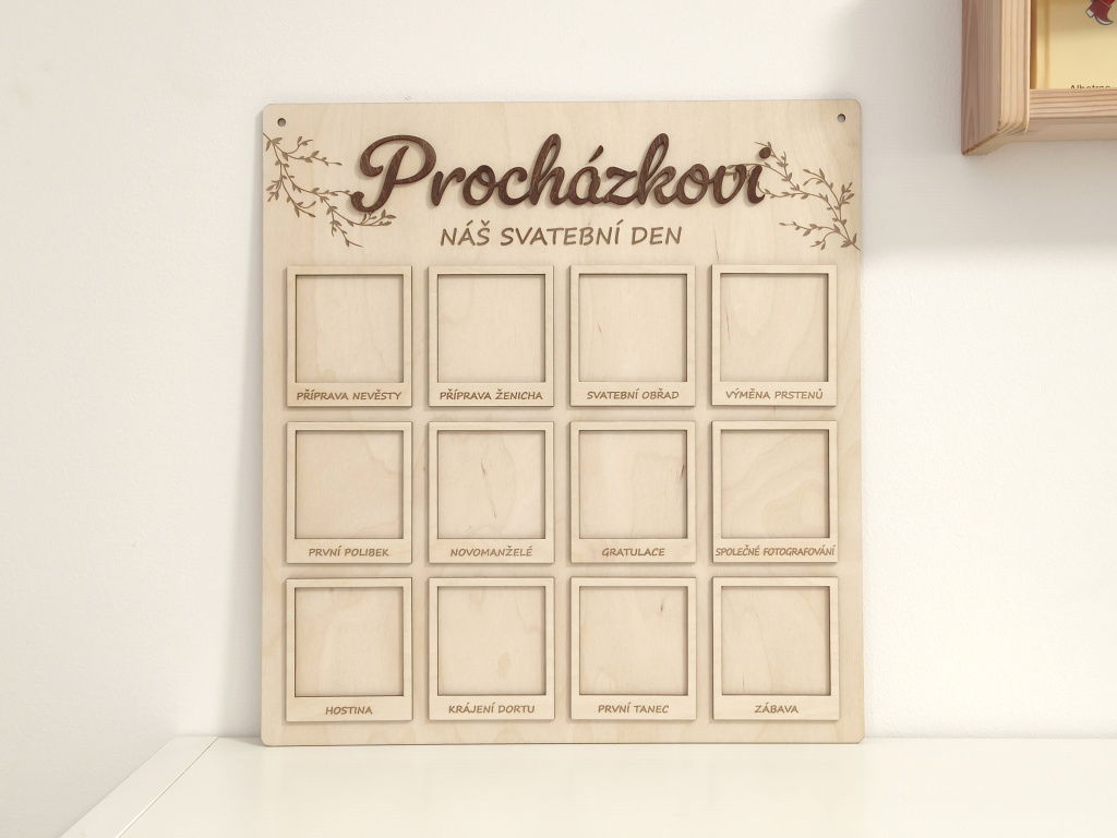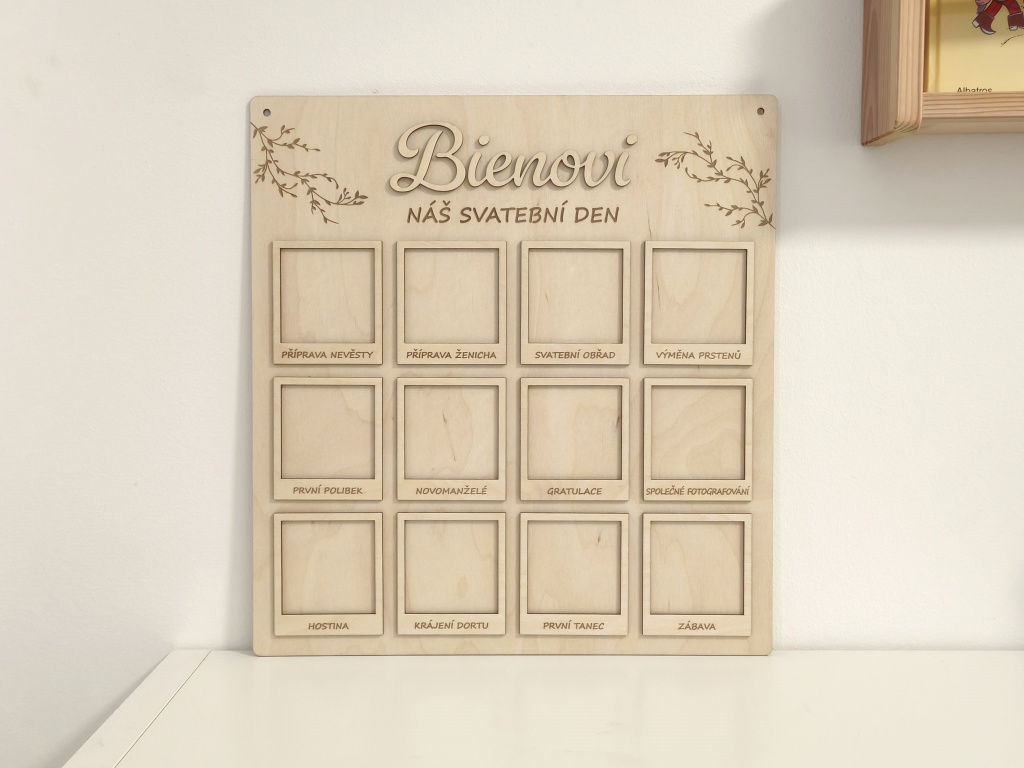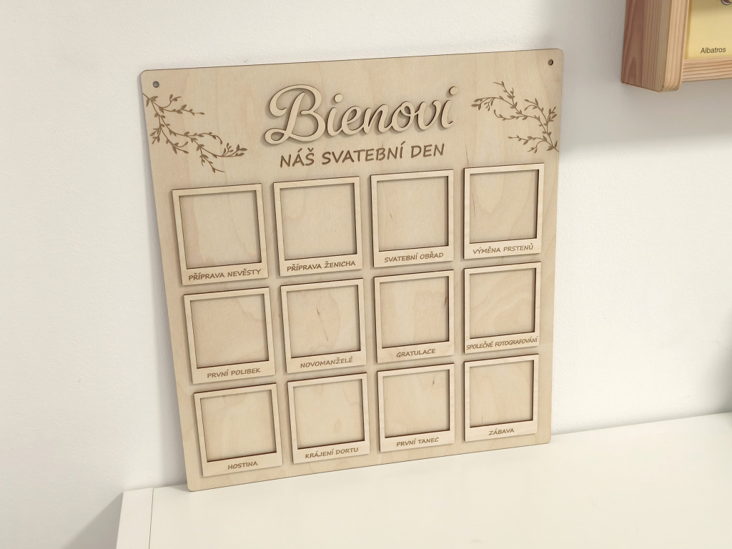 Představujeme Vám krásnou a originální dřevěnou desku na svatební fotografie s jemným gravírovaným motivem větviček, 3D příjmením novomanželů dle Vašeho přání a dvanácti 3D rámečky, které zachycují celý svatební den ve 12 nezapomenutelných okamžicích. Jedná se o jedinečný a osobní svatební dar, který nebude ležet v koutě, ale stane se přirozenou součástí interiéru a každodenní připomínkou jednoho z nejkrásnějších dnů v životě.