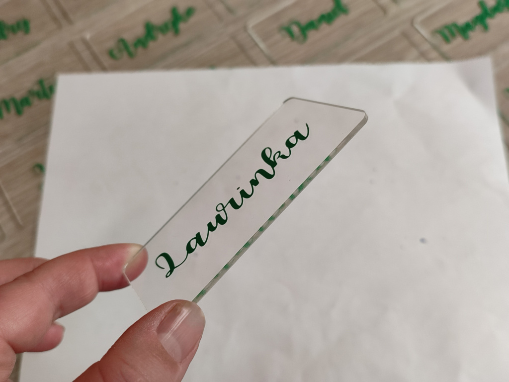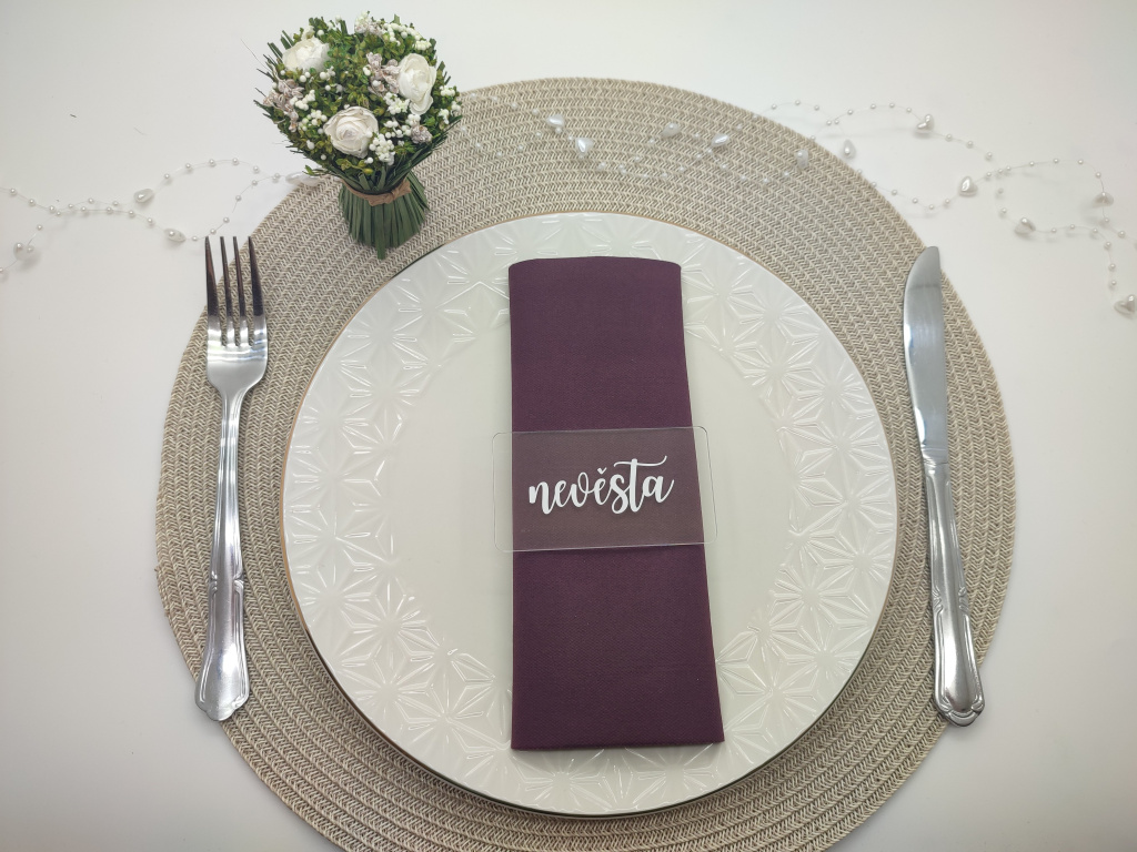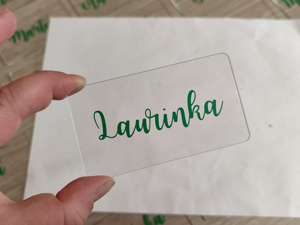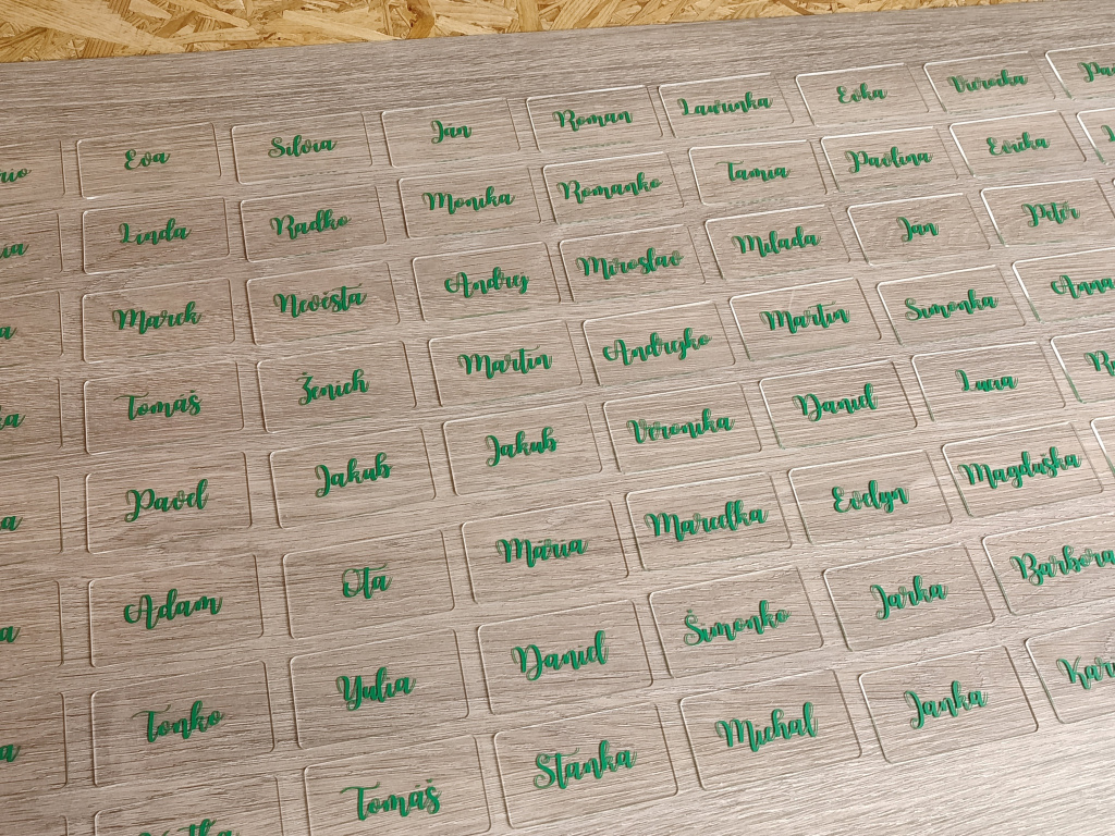 Jméno na jmenovce je vyrobeno z kvalitní vinylové fólie, jejíž barvu si snadno vyberete v konfigurátoru produktu tak, aby ladila s Vaší svatební výzdobou. Styl písma zůstává stejný jako na fotografii – mění se pouze barva a samotné jméno. Díky tomu budou všechny jmenovky dokonale sladěné a vytvoří krásný detail, který podtrhne celkovou atmosféru Vašeho svatebního dne.