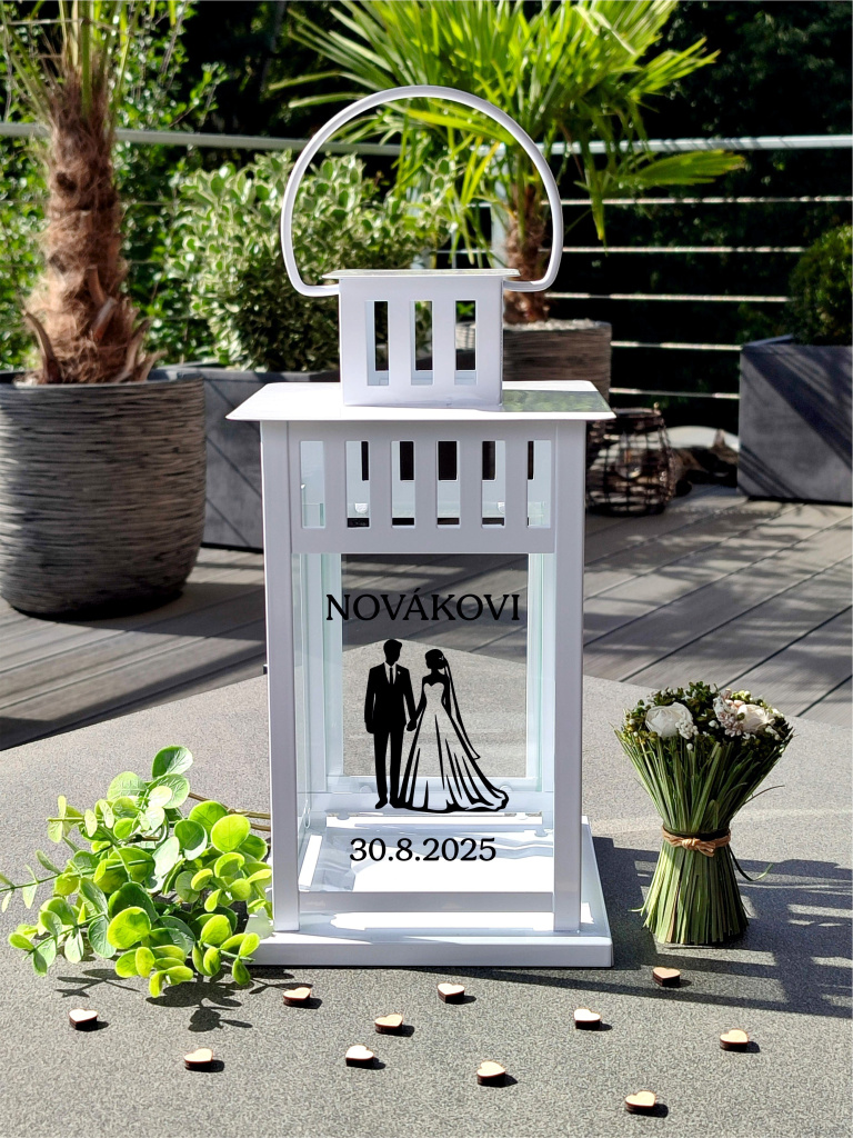 Svatební lucerna se společným příjmením novomanželů, datem svatby a motivem svatebního páru je originálním a stylovým doplňkem, který dodá Vaší svatbě romantickou atmosféru. V naší nabídce naleznete elegantní bílé i černé provedení luceren.