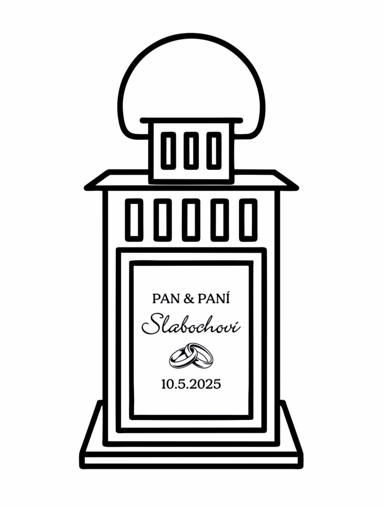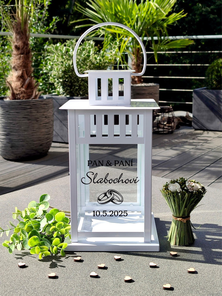 Svatební lucerna je originálním a stylovým doplňkem, který dodá Vaší svatbě romantickou atmosféru. V naší nabídce naleznete elegantní bílé i černé provedení luceren. Každá lucerna je jedinečná – na jedno sklo umístíme nápis PAN & PANÍ spolu s příjmením novomanželů a datem svatby dle Vašeho přání. Lucerna je kovová se skleněnými okýnky, text je vyroben z kvalitní vinylové fólie, jejíž barvu si můžete vybrat v konfigurátoru produktu, takže dokonale sladíte vzhled lucerny s Vaší svatební výzdobou. Více informací