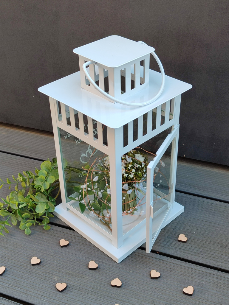 Tato elegantní kovová lucerna se skleněnými okýnky je krásnou dekorací na svatební tabuli, u vchodu do sálu i originálním dárkem, který novomanželům zůstane jako památka na jejich výjimečný den. Do lucerny lze umístit LED světýlka, květiny, sušené dekorace či další drobnosti, které podtrhnou slavnostní atmosféru. Je ale důležité mít na paměti, že lucerna není vhodná pro použití se svíčkou ani s jiným zdrojem tepla. Pro zachování krásného vzhledu doporučujeme lucernu nevystavovat nepříznivým vlivům počasí. Výška lucerny je 28 cm.