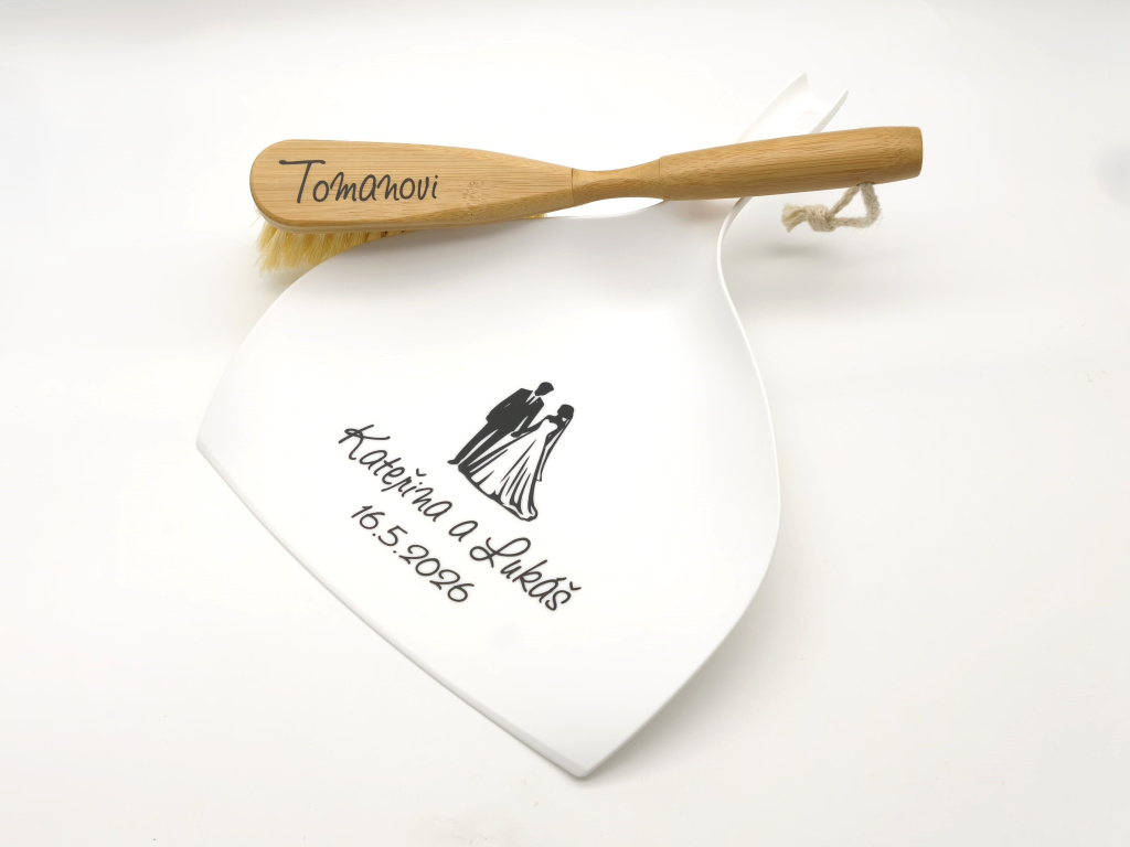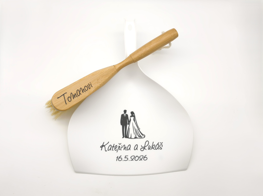 Lopatku zdobí elegantní motiv siluety nevěsty a ženicha, kteří stojí bok po boku jako symbol lásky, jednoty a nového společného začátku. Společně s Vašimi jmény a datem svatby vytváří krásnou a osobní vzpomínku na den, kdy jste si řekli své ano. Na smetáčku je uvedeno společné příjmení novomanželů. Veškeré údaje i motiv jsou vyrobeny z kvalitní vinylové fólie s precizním a elegantním zpracováním.
