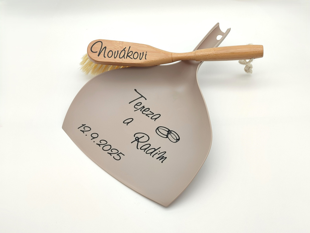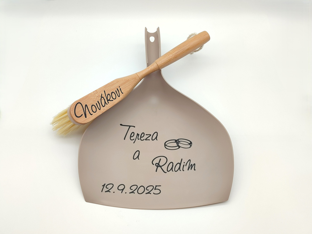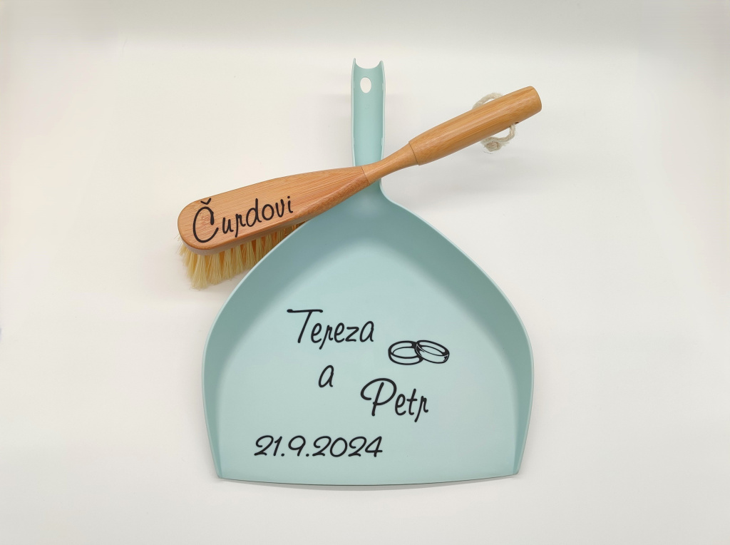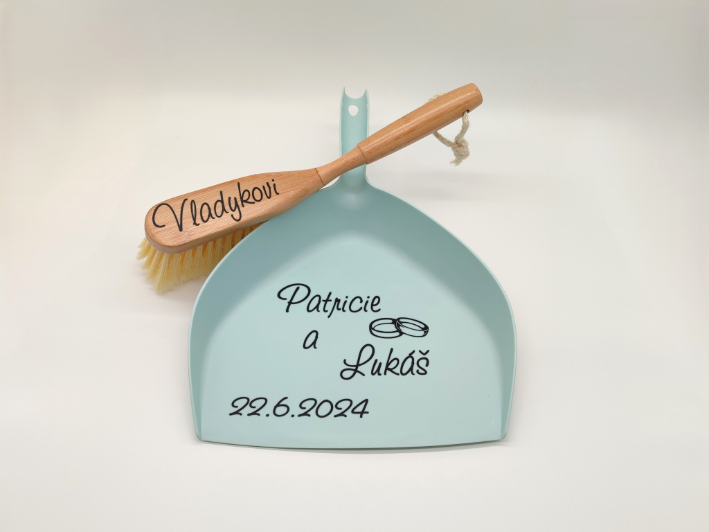 Lopatku zdobí elegantní motiv propojených snubních prstýnků – nadčasový symbol manželství, věčné lásky a vzájemného spojení dvou srdcí. Společně s Vašimi jmény a datem svatby vytváří krásnou a osobní vzpomínku na den, kdy jste si navlékli prstýnky a řekli své ano. Na smetáčku je uvedeno společné příjmení novomanželů, které celou sadu harmonicky doplňuje. Veškeré údaje i motiv jsou vyrobeny z kvalitní vinylové fólie s precizním a elegantním zpracováním.