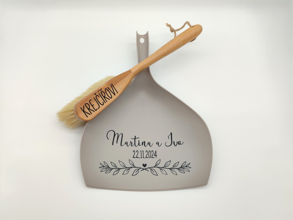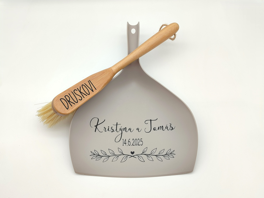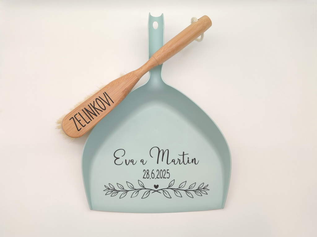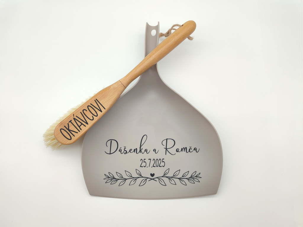 Lopatku zdobí jemný motiv větvičky, který působí přírodně, elegantně a nadčasově. Větvička symbolizuje růst, nový začátek a rozkvět společného života. Společně s Vašimi jmény a datem svatby vytváří harmonickou a osobní vzpomínku na den, kdy jste si řekli své ano. Na smetáčku je uvedeno společné příjmení novomanželů, které celý set krásně sjednocuje. Veškeré údaje i motiv jsou vyrobeny z kvalitní vinylové fólie s precizním a elegantním zpracováním.