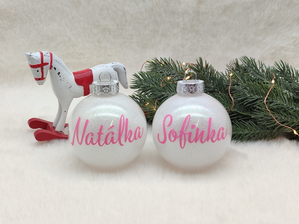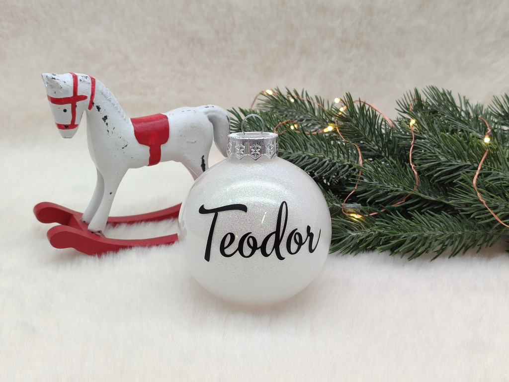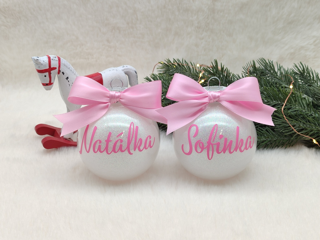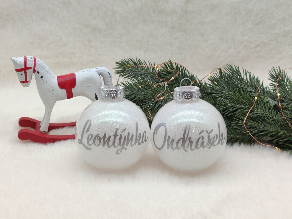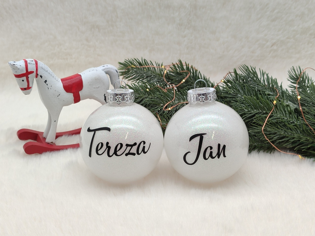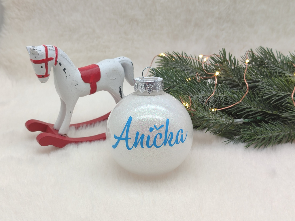Elegantní plastová baňka s bílými glitry uvnitř rozzáří každý vánoční stromeček. Ozdoba je doplněna jménem dle Vašeho přání, a tak skvěle poslouží i jako milý dárek. Barvu jména si můžete zvolit, stejně tak i variantu s mašlí nebo bez ní. Krásná a praktická vánoční ozdoba na stromeček, ideální především pro rodiny s malými dětmi a zvířecími mazlíčky. Více informací