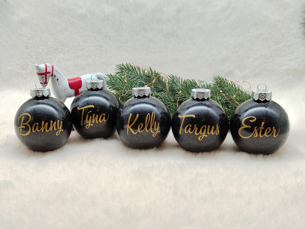 Elegantní plastová baňka s černými glitry uvnitř rozzáří každý vánoční stromeček. Ozdoba je doplněna jménem dle Vašeho přání, a tak skvěle poslouží i jako milý dárek. Barvu jména si můžete zvolit, stejně tak i variantu s mašlí nebo bez ní. Krásná a praktická vánoční ozdoba na stromeček, ideální především pro rodiny s malými dětmi a zvířecími mazlíčky. Více informací