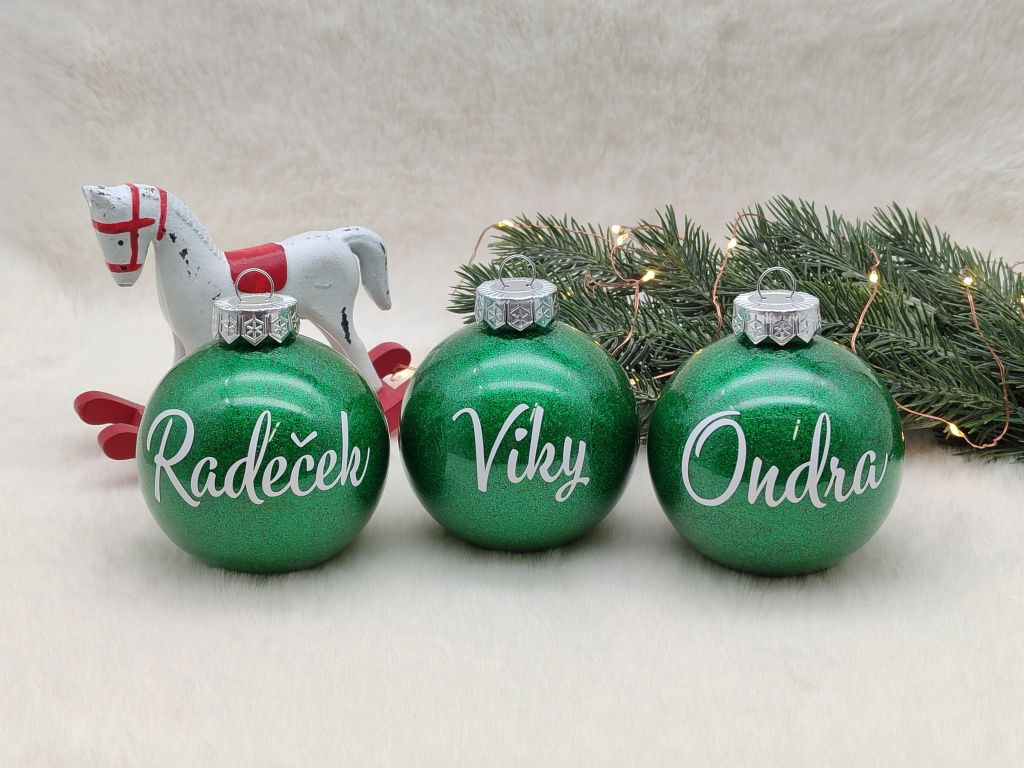 Elegantní plastová baňka se zelenými glitry uvnitř rozzáří každý vánoční stromeček. Ozdoba je doplněna jménem dle Vašeho přání, a tak skvěle poslouží i jako milý dárek. Barvu jména si můžete zvolit, stejně tak i variantu s mašlí nebo bez ní. Krásná a praktická vánoční ozdoba na stromeček, ideální především pro rodiny s malými dětmi a zvířecími mazlíčky. Více informací