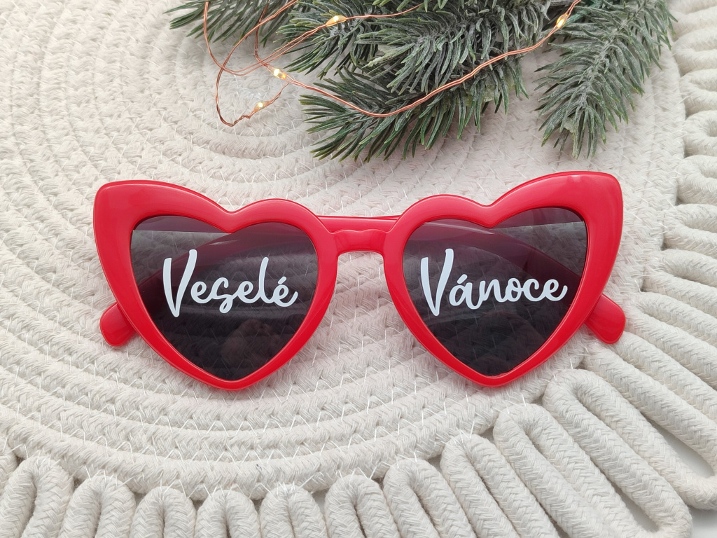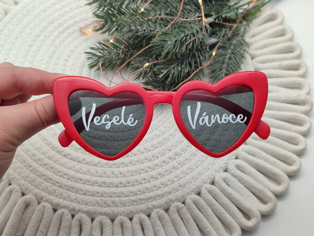 Stylové dekorativní vánoční brýle ve tvaru srdce s nápisem „Veselé Vánoce“ jsou ideálním doplňkem pro vánoční večírky, rodinné oslavy, vánoční focení i silvestrovskou zábavu. Nápis je vyroben z kvalitní vinylové fólie, jejíž barvu si můžete zvolit v konfigurátoru produktu podle svých představ. Stejně tak si můžete vybrat i barvu samotných brýlí – k dispozici jsou varianty červená, bílá, černá, růžová a zelená. Více informací